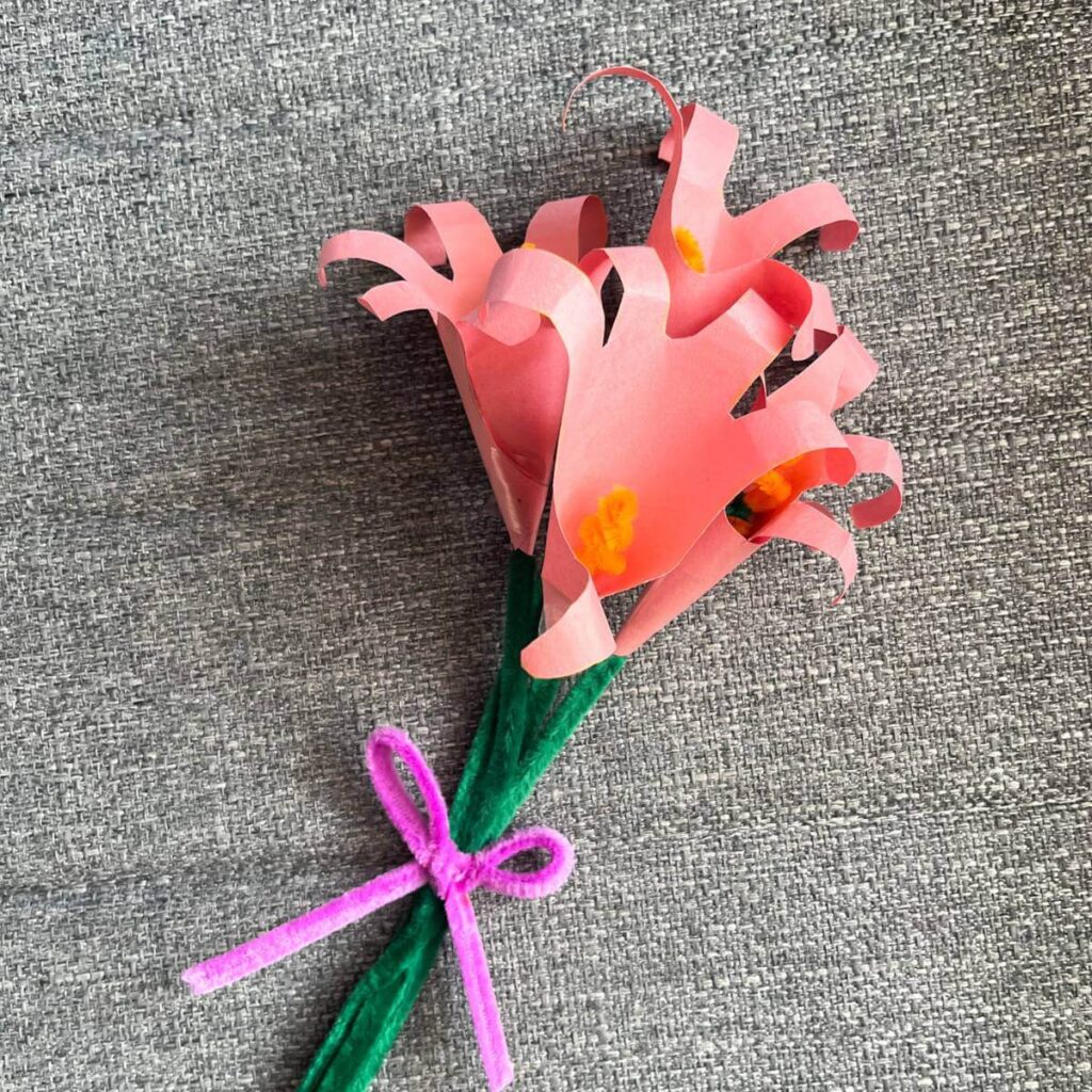 Lastly, you can secure all your flowers together with a bow! We used a different colored pipe cleaner for our bouquet, but you can also use a ribbon if you have one.