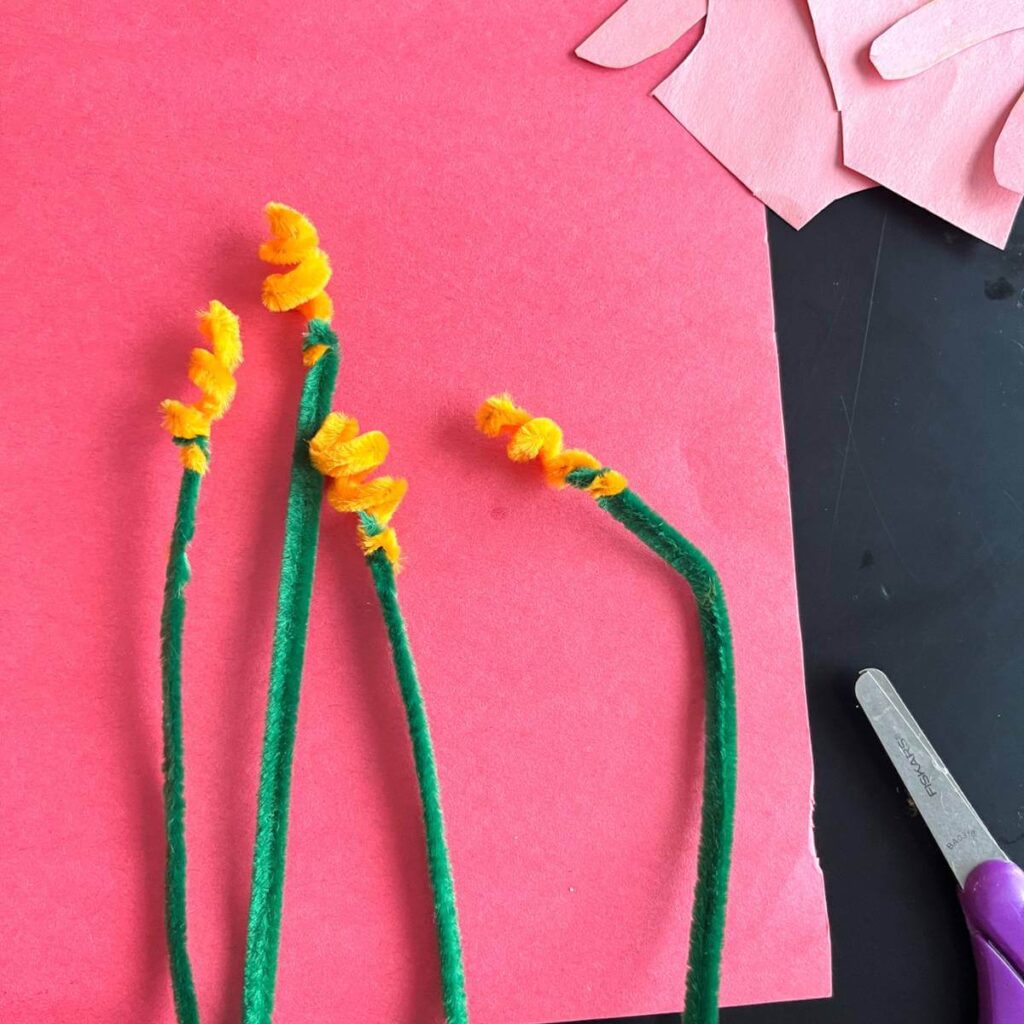 Next, take a yellow pipe cleaner and cut it into halves or thirds. Then, roll each piece around your child’s finger to make it curly. After, twist the yellow piece onto the end of a green pipe cleaner to make the stems.