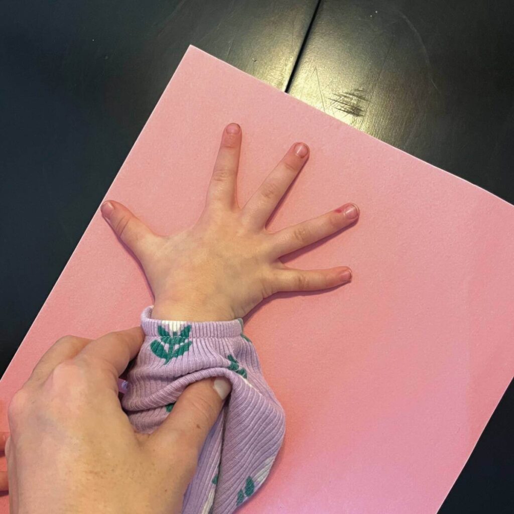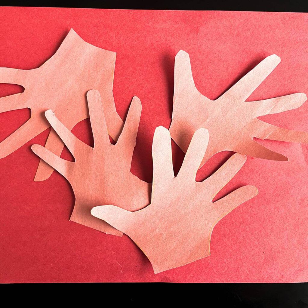 Next, cut out each sweet handprint. Your child can help if they’re used to using scissors for some fine motor practice, but cutting out the little fingers can be frustrating for kids. We have a lot of tips here for helping young kids with scissors.