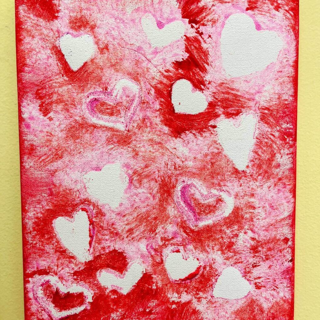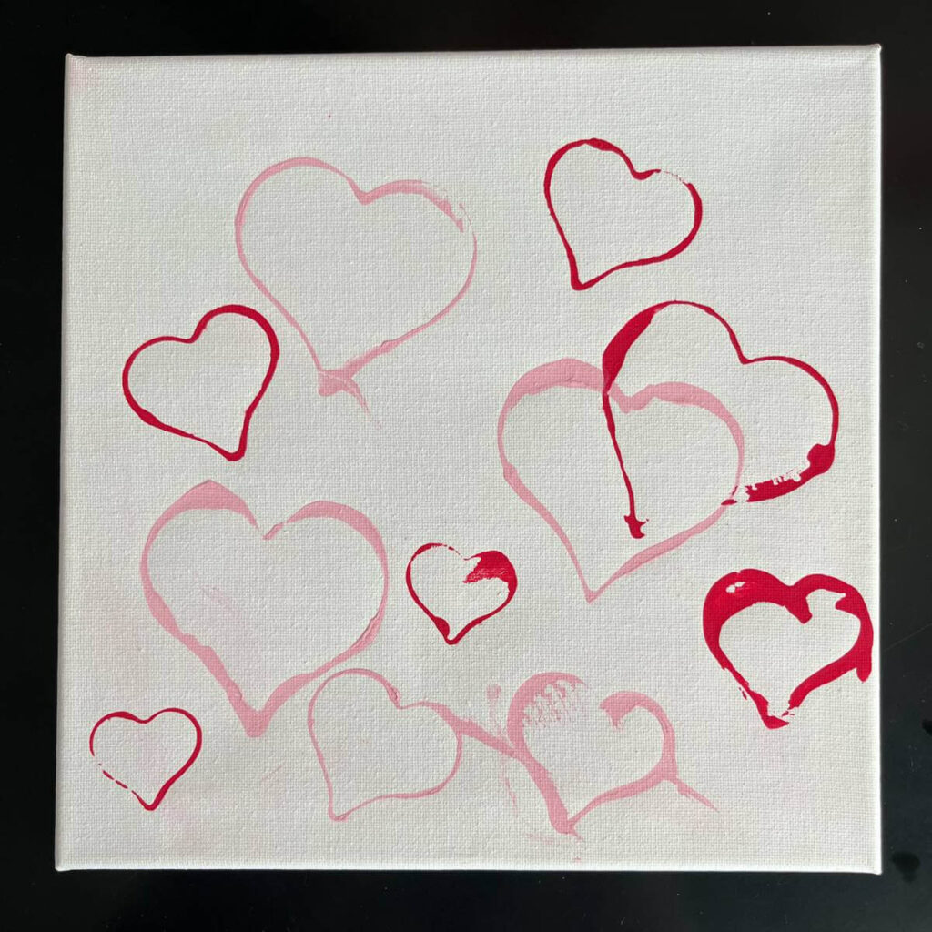 There’s a very wide range to how your paintings will turn out. My grandson liked his hearts to overlap and fill the whole canvas, but my granddaughter didn’t want any of hearts to touch. Either way works, and your child’s may even come out with all smudged hearts (like many preschoolers do!).
