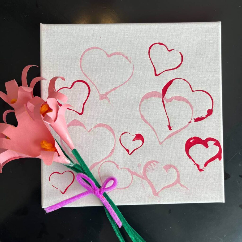 We used canvases for this project so we could hang them in the house, but you can also use a piece of paper. Let your child stamp hearts onto a bunch of papers to make into valentines or handmade cards. Or just let them do it on a bunch of construction paper for the fun of it!