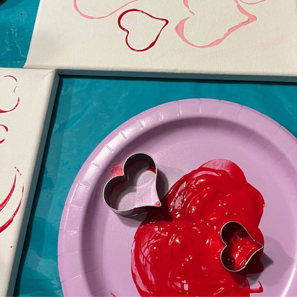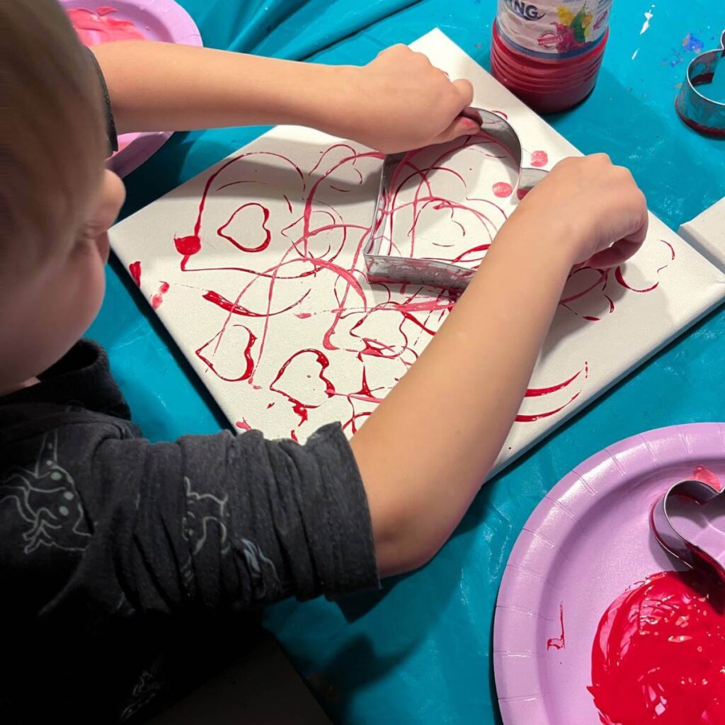 Then, you let your child get to painting. For younger kids, show them the first few times how to stamp the heart down and lift it up. We also found it helpful to show your child to rub the cookie cutter in the paint a few times to make sure there’s enough paint on it.